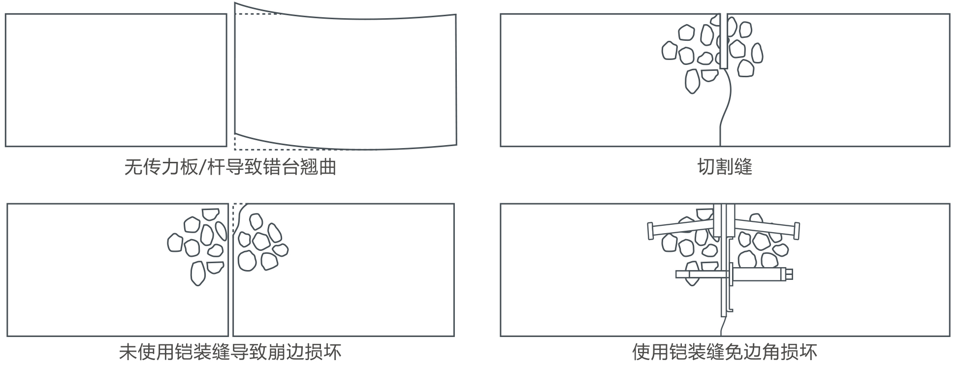 1 兩個板塊易發(fā)生錯臺、翹曲及崩邊等情況;2 施工縫張開后,由于震動密實導(dǎo)致骨料下沉,邊緣強度不夠容易崩邊損壞。